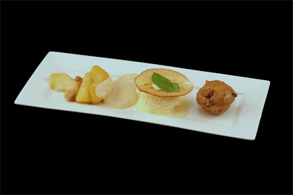 Vanille ijs, gebakken appel, cranberrymuffin en kaneelsabayon