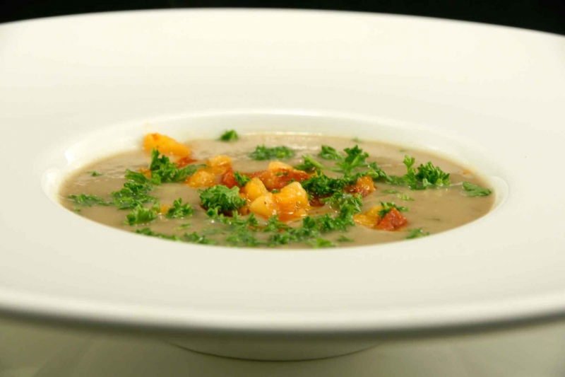 - Schep de velouté in een warm diep bord en werk af met de gebakken chorizo- en appelblokjes. Strooi er wat fijngehakte peterselie over.