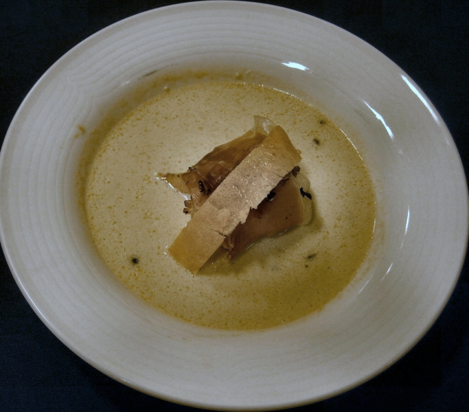 Velouté van Prei met Truffelolie Gebakken Coquille in serranoham