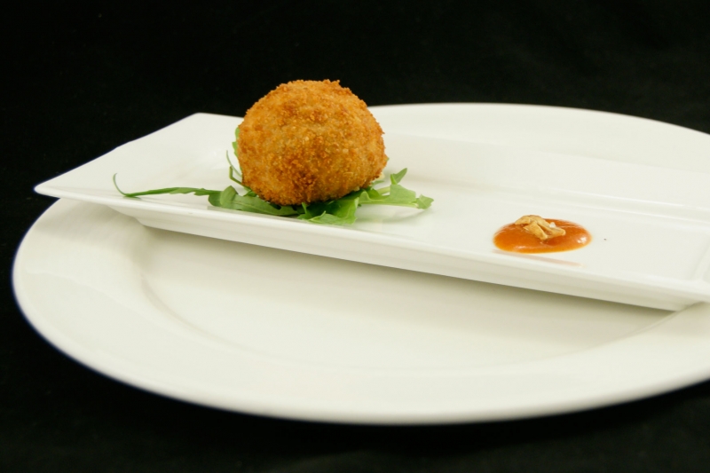 - Maak met behulp van een eetlepel 14 bolletjes van de aardappel-venkelpuree ter grootte van een ei. Druk een bolletje puree plat in je handpalm. Doe in het midden een mini-mozzarellabolletje en vorm vervolgens een rond kroketje. Herhaal dit nog 13 keer. Zet de kroketjes 10 minuten in de blastchiller.