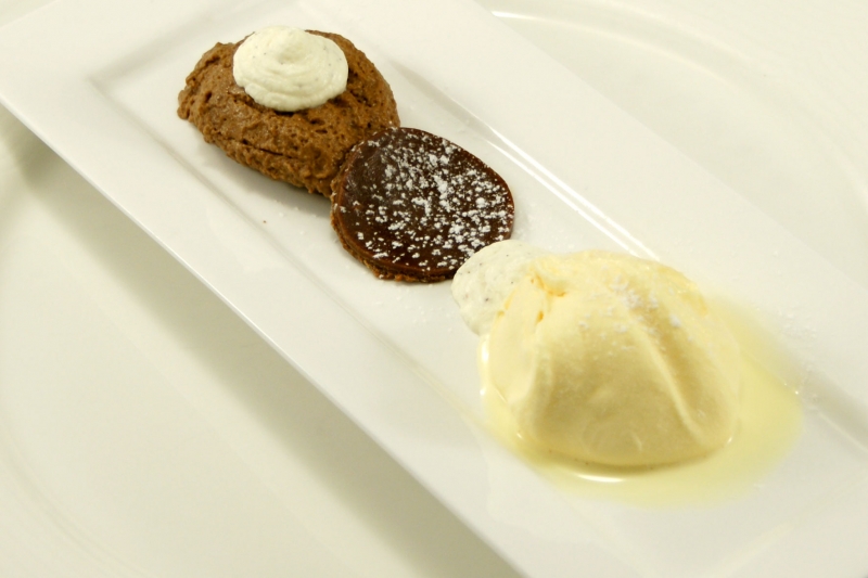 - Leg een bolletje ijs in een klein steelpannetje op het bord en zet er schuin een karamel-chocoladepastille tegenaan.