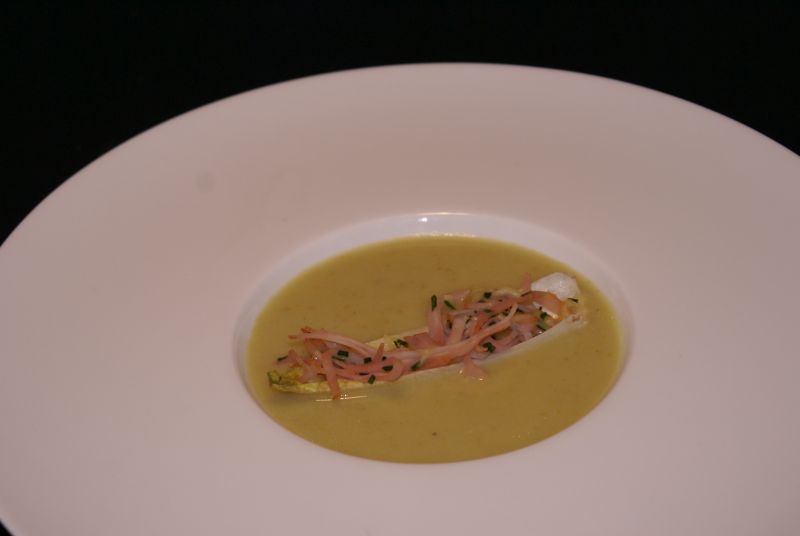 - Smelt boter in een pan en fruit hierin zachtjes de ui en de witlof, niet laten verkleuren! Voeg hier dan de aardappel en de bouillon aan toe en laat dit gaar koken.