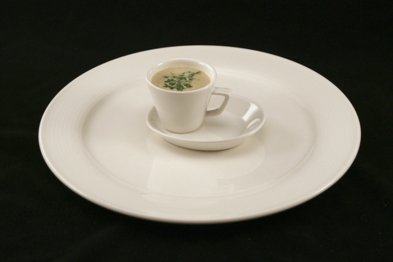 - De soep in kleine amuse kopjes presenteren en afmaken met knapperige stukjes ontbijtspek en garneren met peterselie.