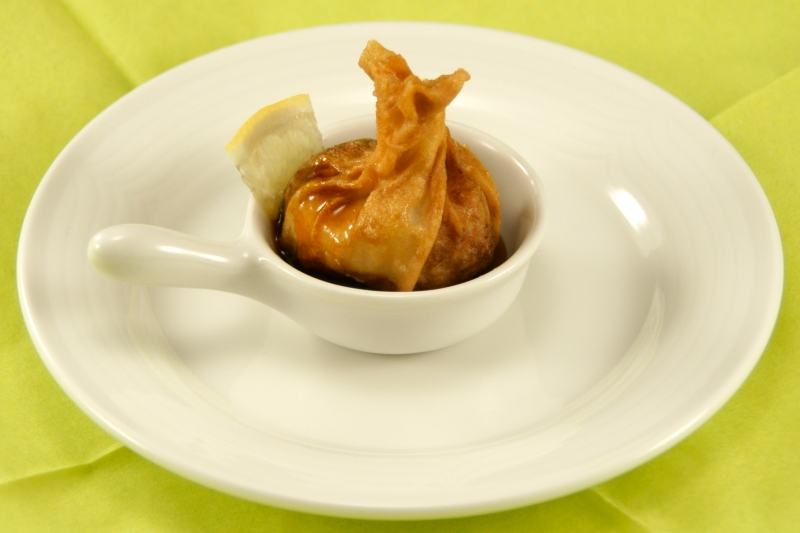 - Serveer de gefrituurde wontonzakjes op een spiegeltje van saus in een klein wit steelpannetje en leg er een klein partje limoen bij.