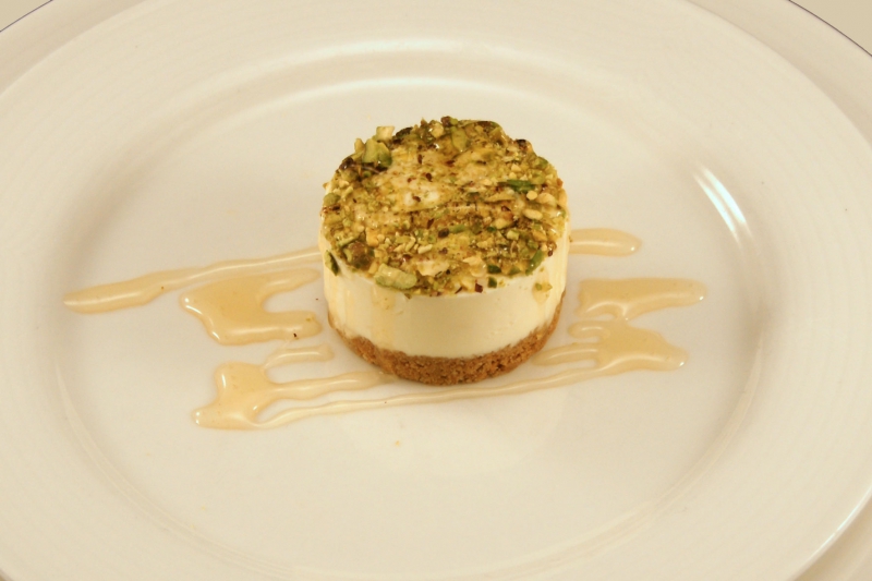 - Bestrooi de cheesecake met de fijngehakte pistachenootjes