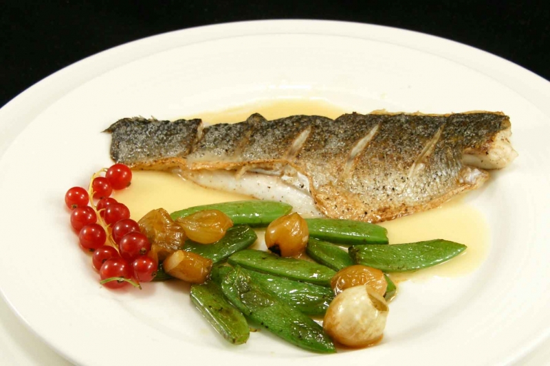 Zeebaars met Sauternessaus en sugar-snaps met zilveruitjes