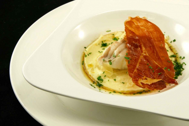 - Leg een 1/2 plak krokante Serranoham op de zeeduivel.