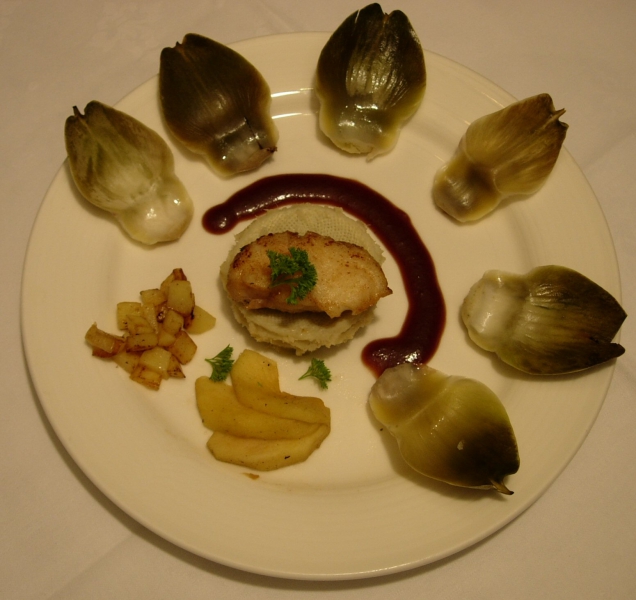 - Leg in het midden de artisjokbodems. Leg hierop de vis. Leg er wat spekblokjes, appelschijfjes en aardappeltjes tegen de artisjokbodem aan. Nappeer de saus er omheen. Garneer de borden op de rand met bladeren van de artisjokken.