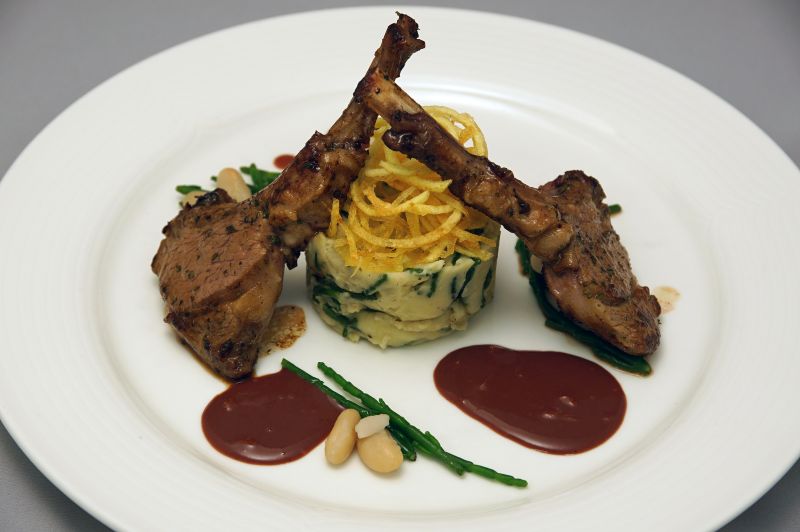 - Schroei de drooggedepte lamskroontjes dicht vlak voor uitserveren en laat ze even rusten op een warme plaats.