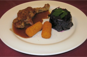 - Stort het ramequin op het bord. Houd de onderkant tijdens het storten tegen met een platte schep, zodat ze mooi gestort worden. Garneer de top een takje selderij.2.Leg een eendenboutje op het bord en overgiet het met saus.3.Leg er aardappelkroketjes bij.