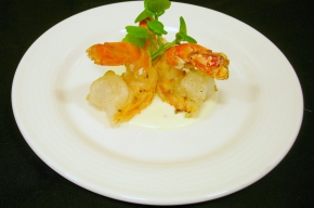 - Schalen aanzetten in olijfolie, cayennepeper en knoflook toevoegen, afblussen met cognac.
