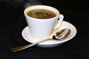 - Strooi er uitgebakken spekjes over en garneer het geheel met een takje kervel.