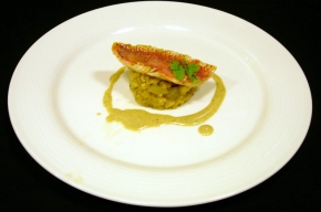 Op de huid gebakken rode mulfilet met milanese risotto en dragonsaus