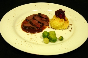 Haasfilet ‘Leonora’ met cranberry’s, aardappelrozetje en spruitjes