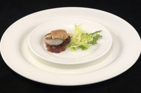 Gegrilde coquille op auberginecompote met een ganzenleverkrul