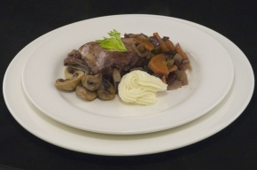 - Neem warme borden. Leg op ieder bord één stukje kip en spuit een toef aardappelpuree op het bord.