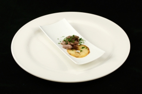 - Leg op ieder bord een taartje met twee bolletjes (ijslepel) rauwe salade en een bolletje compote voeg de wildstoofschotel met wat jus toe.