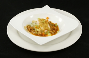- Bedek de zalm met de groentes. Druppel de vadouvan hollandaise erover en schenk de bietenbouillon met de garnaaltjes erbij.