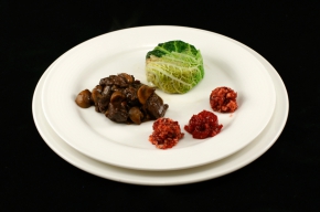 Wildstoofpot met spruitentaartje en cranberrysalade