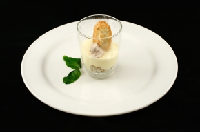 - Bestuif de mascarpone met cacaopoeder en steek een takje mint en een koekje in de mascarpone.