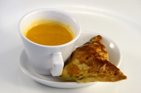 - Zet de muffin, het glaasje met de tiramisu en de fudge op een bordje en serveer uit met een kopje koffie/thee en een glaasje Frangelico. Gebruik de Frangelico die op het sterke drank rek staat bij de bar.