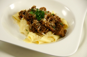- Doe in ieder bord een schep pappardelle en schep daar bovenop een lepel ragu.
