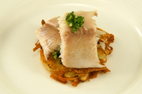 - Rook de forellen ongeveer 8 minuten en gaar ze na in een oven van 175 graden. Laat afkoelen tot kamertemperatuur en verwijder het vel en de graten. Bewaar de vis op kamertemperatuur. (bovenop de warmhoudkast wanneer het koud is in de keuken)