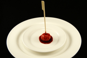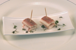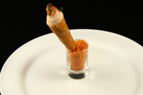 - Vervolgens een met spek omwikkelde dadel, een gekonfijt eendenpootje, spruitjes en een soesje.
