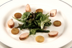 - Leg op de bonensalade een toefje gesneden salade en garneer af met een streepje truffelmayonaise.