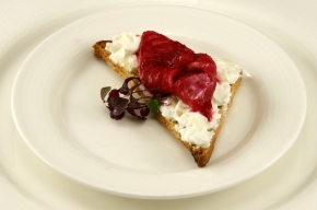 - Eindig met een plakje taleggio en leg daar een klein blaadje peterselie of koriander op.