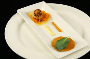 Coquilles met 2 bereidingen van pompoen, vadouvan mayonaise en kerriekletskop