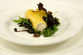 - Voor uitserveren op de reepjes gelei een streep mousse spuiten en daarna oprollen zodat je een cannelloni krijgt.