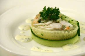 - Leg een dun laagje gelei op de komkommer, daarop een laagje snoekbaars, daarna een laagje gelei en het garnalenmengsel. Zo bouw je de terrine op.