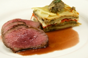 Eendenborst met lasagne van geroosterde groenten, aubergine en kummel