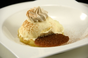 - Hiernaast een quenelle kaneelcrème plaatsen en bestrooien met kaneelpoeder.