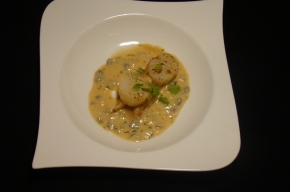 - Saus. Maak van visfond een halve liter visbouillon. Voeg hier de witte wijn en de Noilly Prat aan toe en breng het geheel aan de kook. Laat tot 1/3 inkoken. Voeg de room toe en laat opnieuw inkoken.
