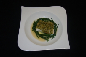 Gebakken kabeljauw met een panade van mosterd en bladpeterselie, aardappelmousseline, blanke botersaus en zeekraal