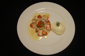 Gegratineerde rabarber met aardbeien en ijs van rozemarijn