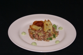 - Maak hoopjes quinoa op het bord en leg er de plakken kalfsmuis op.
