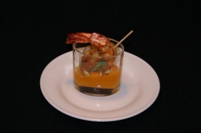 - Steek een houten prikker in de gamba's, zet de gebakken gamba daar bovenop en serveer uit.