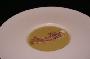 Gamba met pompoen & wortelpuree, pecannoten en affila cress