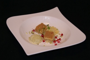 - Garneer met atsina cress, gehakte pistachenootjes en granaatappelpitjes.