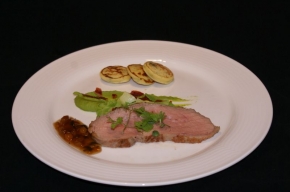 Gebakken kalfslende met een saus van abrikoos en koriander, doperwtencrème en aardappelpoffertjes