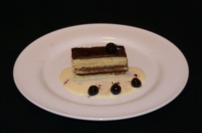 Chocoladetaartje met vanillesaus en amarene kersen