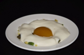 - Spuit het bloemkoolschuim over de groenten, zodat het een spiegelei lijkt.