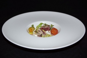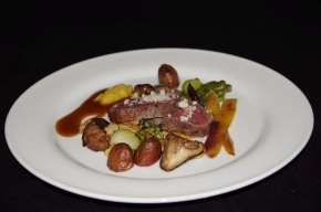 Tournedos met gebakken aardappel, groenten en een illusie van mais