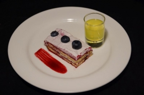 - Leg op een bord een stuk tiramisu en garneer met verse bosbessen.