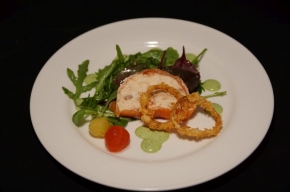 Terrine van snoekbaars met zalm, gemarineerde gele cherrytomaatjes , krokante uienring en basilicummayonaise