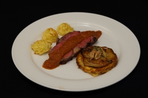 Runder Ribeye uit de oven met ketchup-mosterdjus, bietentaartje en pommes duchesse