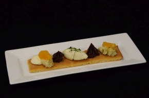 - Zet links van het vlees het bietentaartje en rechts 3 pommes duchesse.